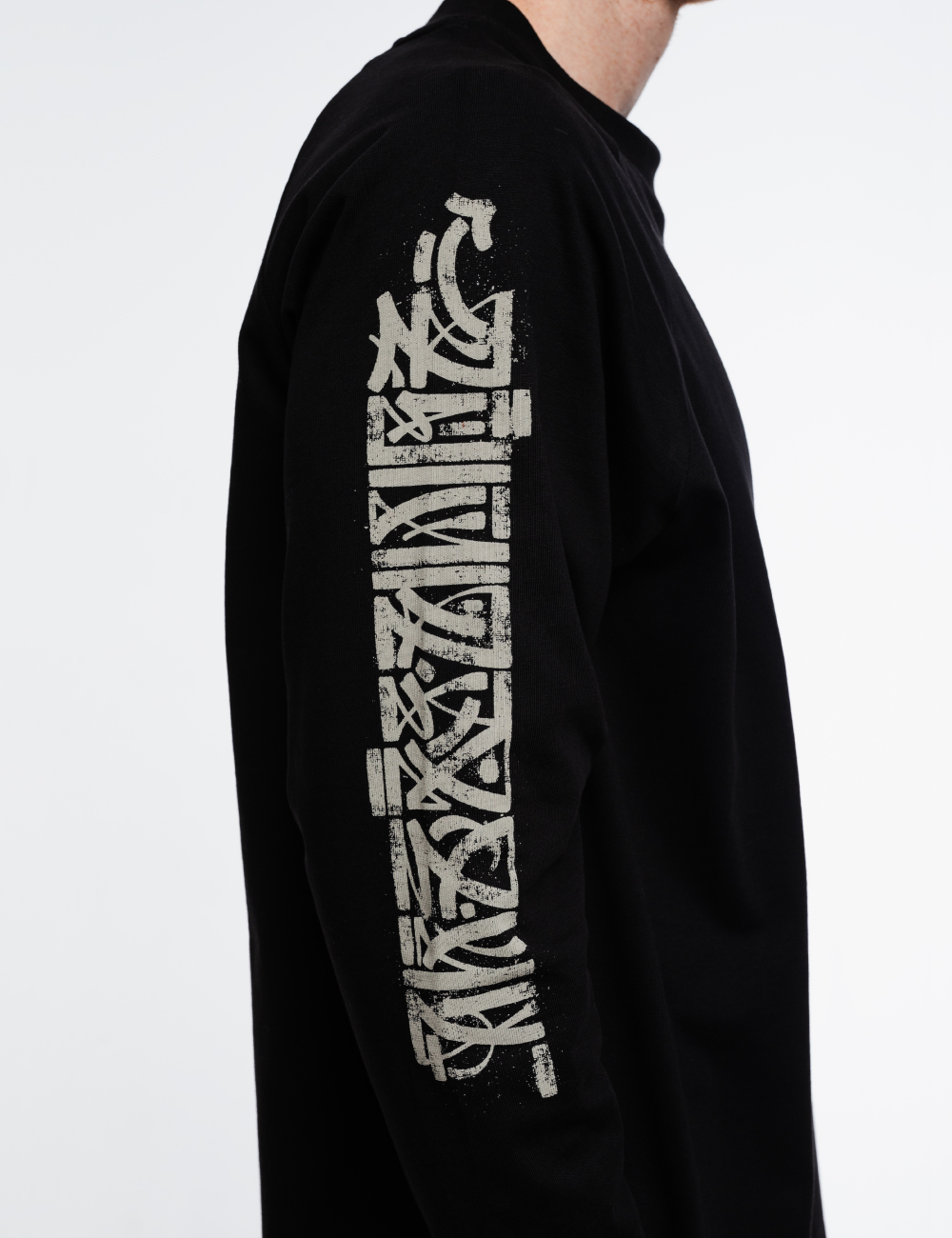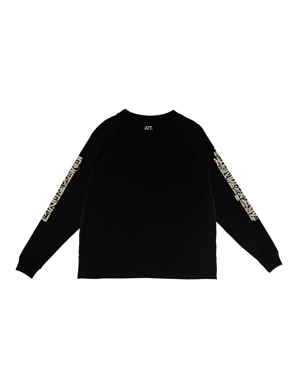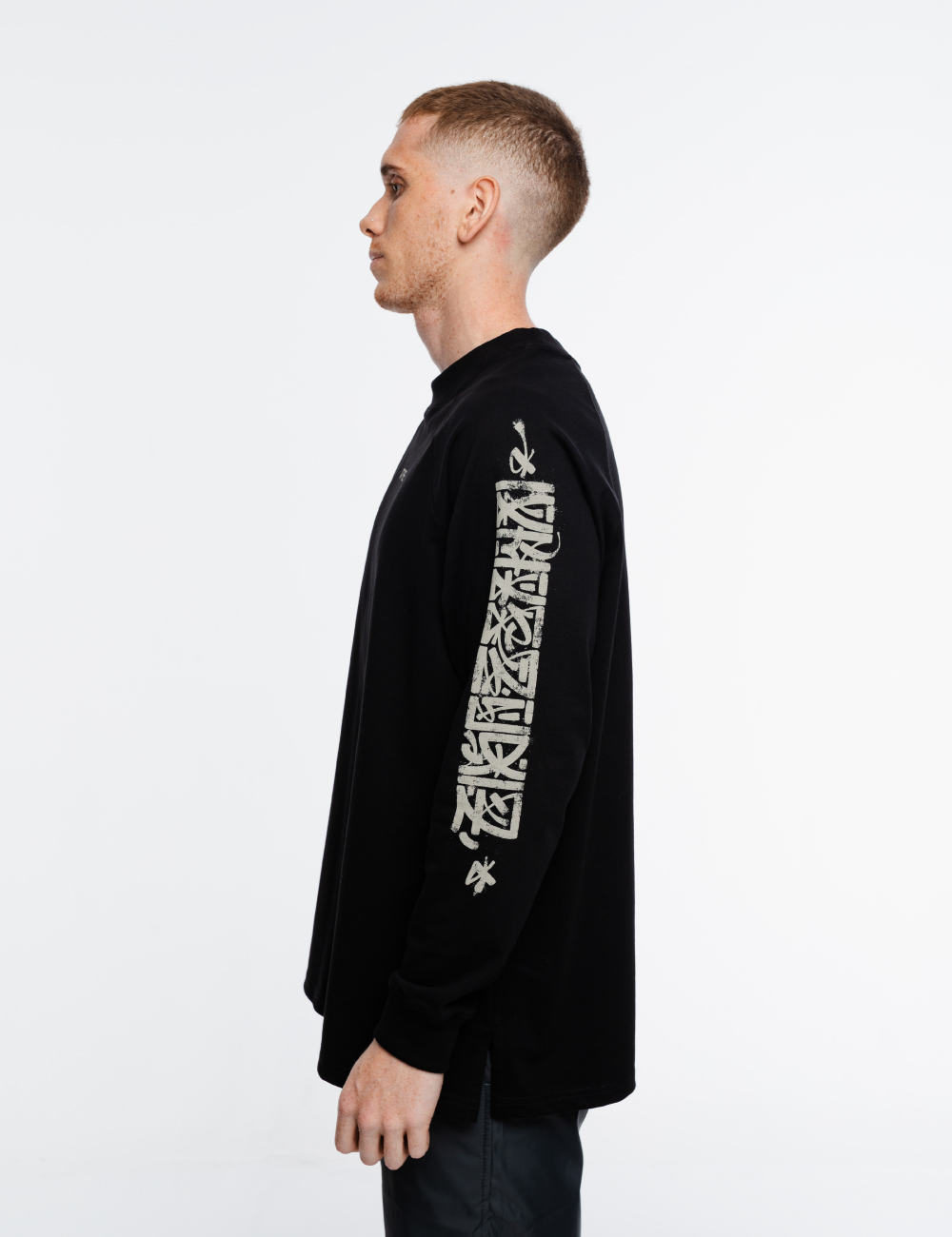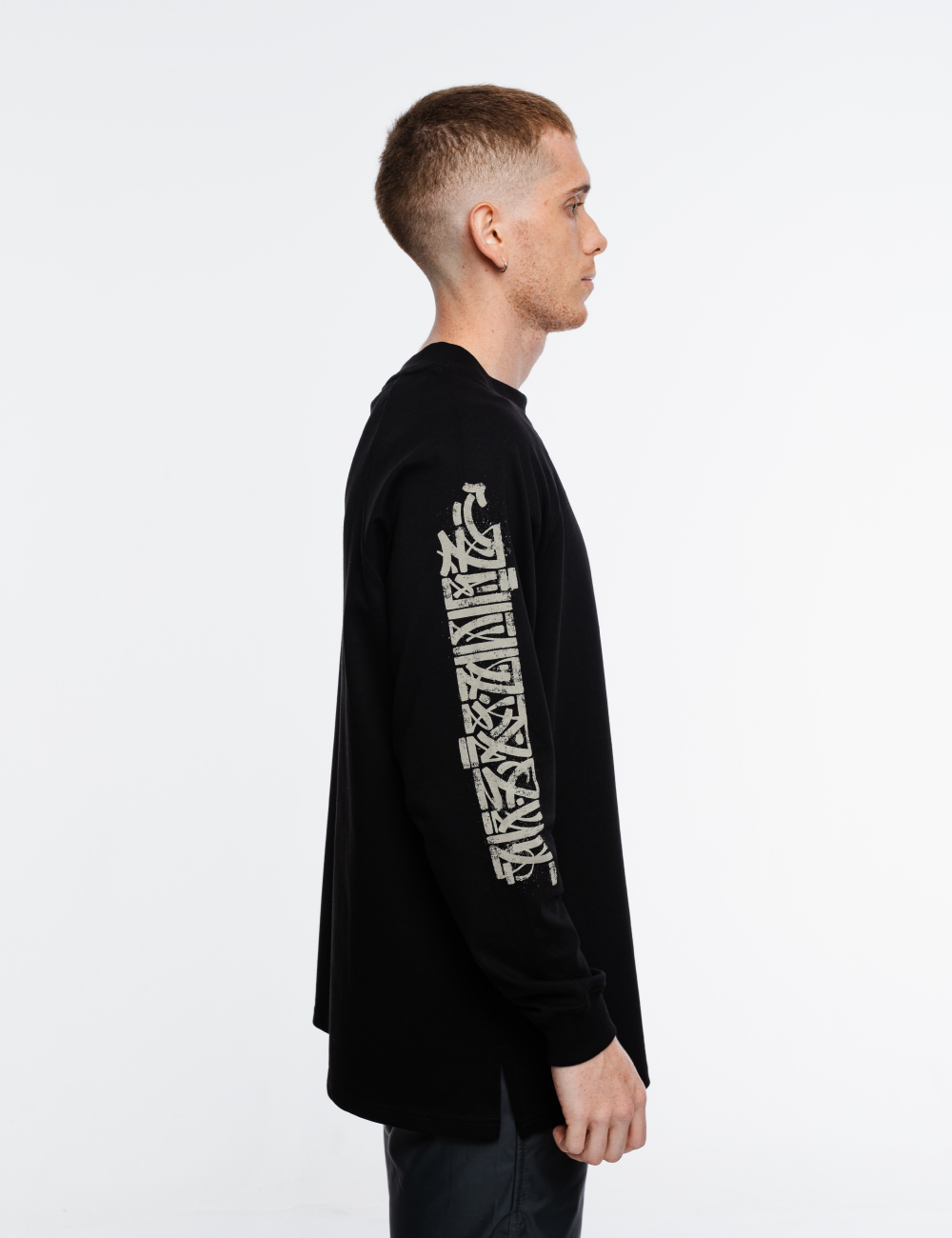 Oversized long sleeve tee in black made from heavyweight 100% cotton jersey printed front, back and sleeves.
