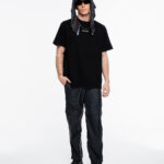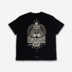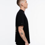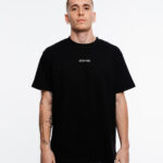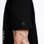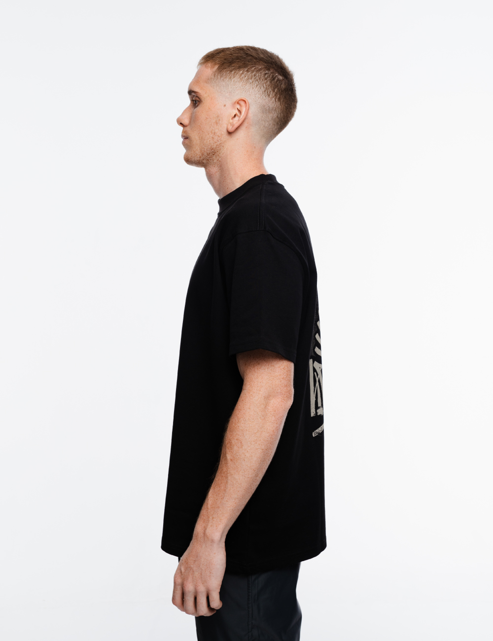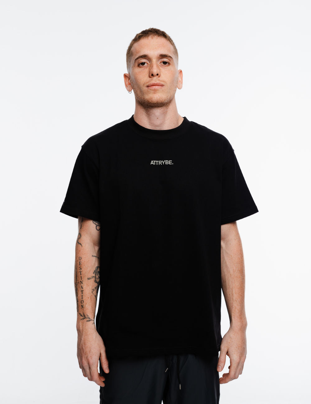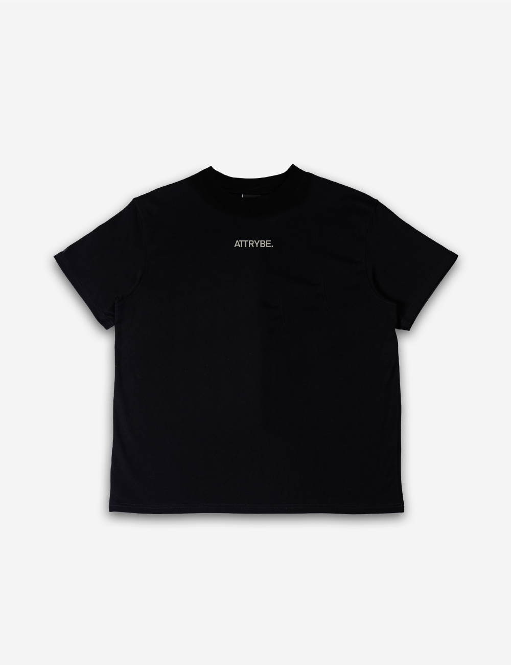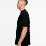 Camiseta de manga corta ligeramente oversize en color negro, fabricada con jersey de algodón pesado 100%, estampado en el frente y la espalda.