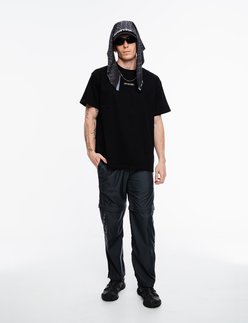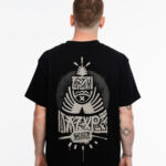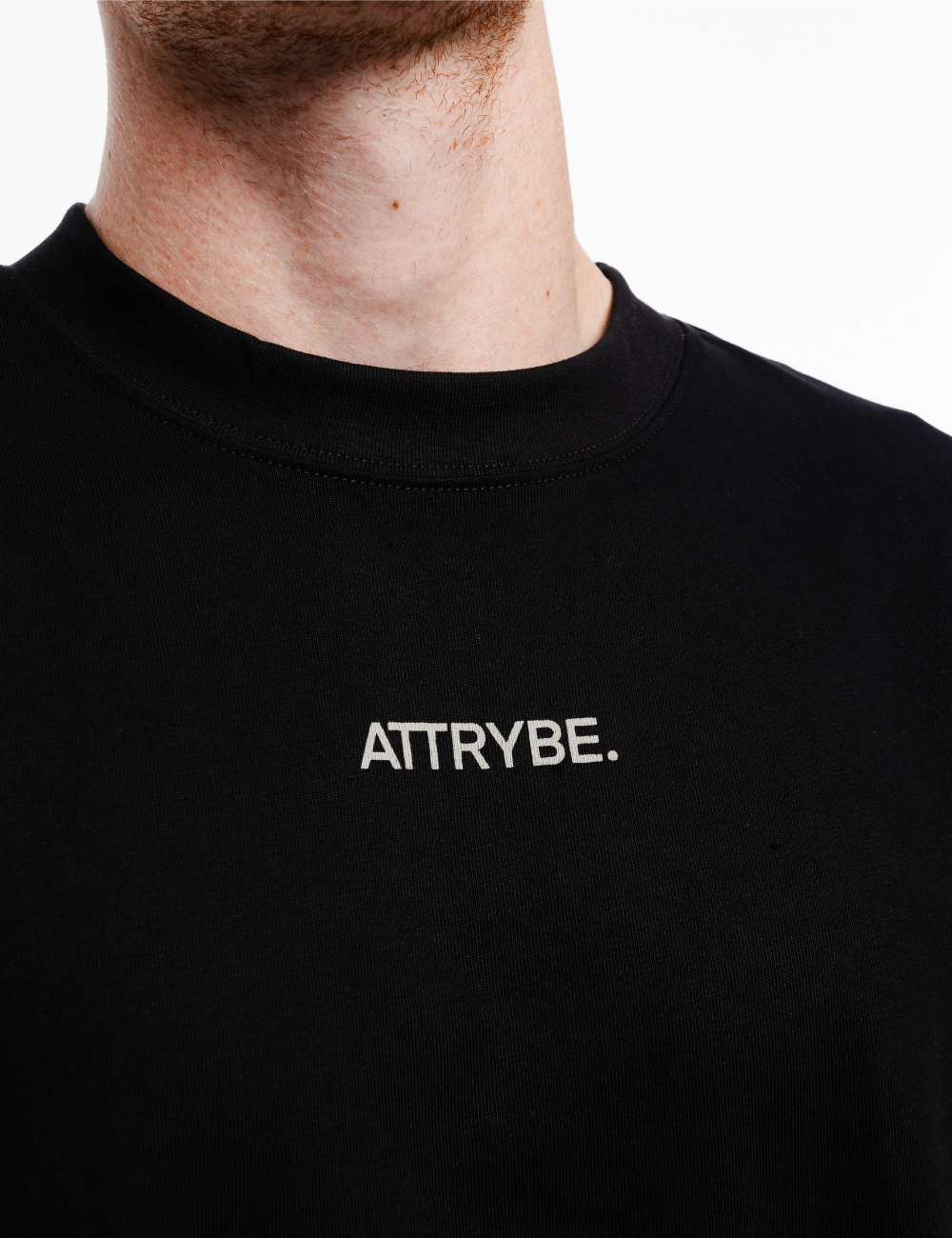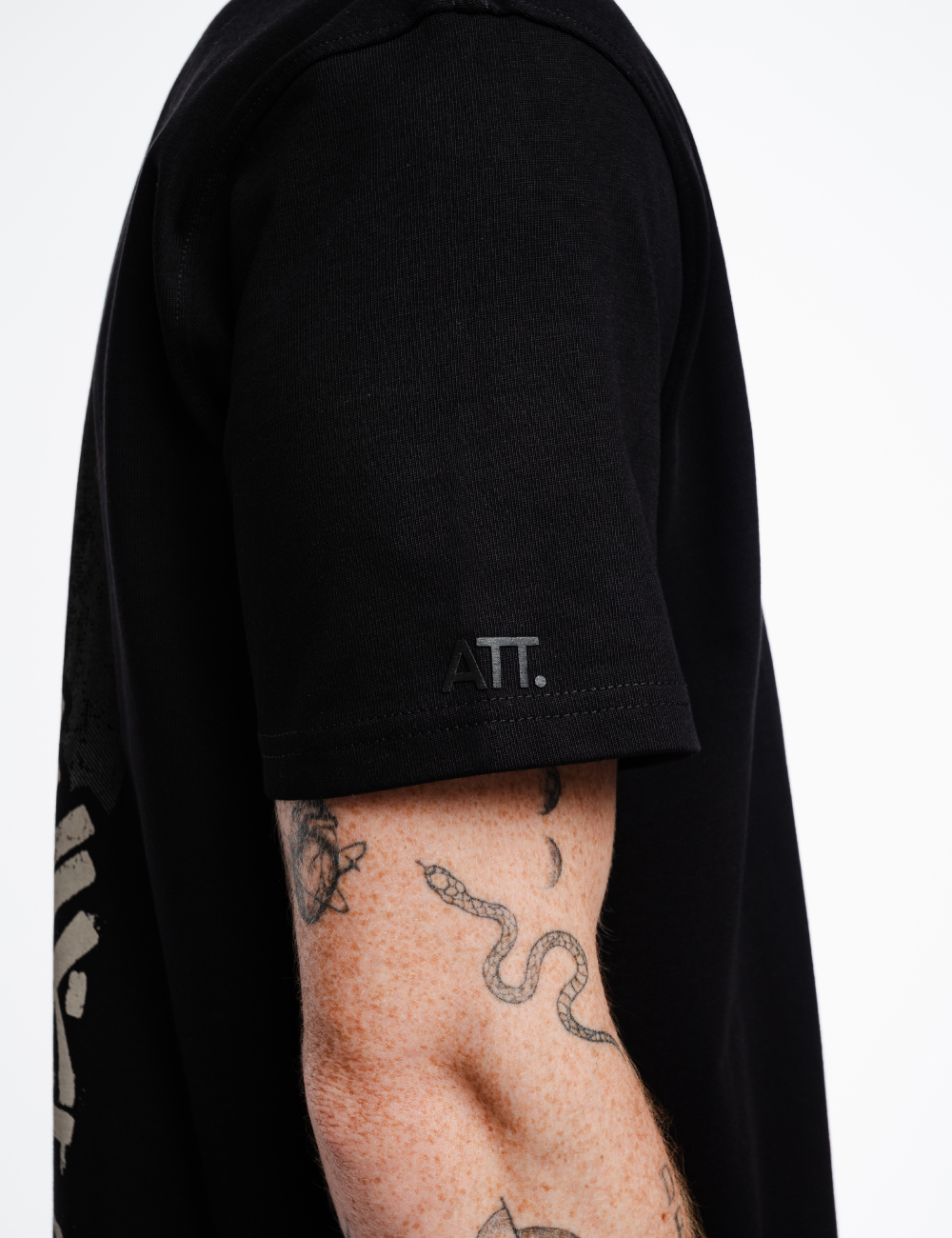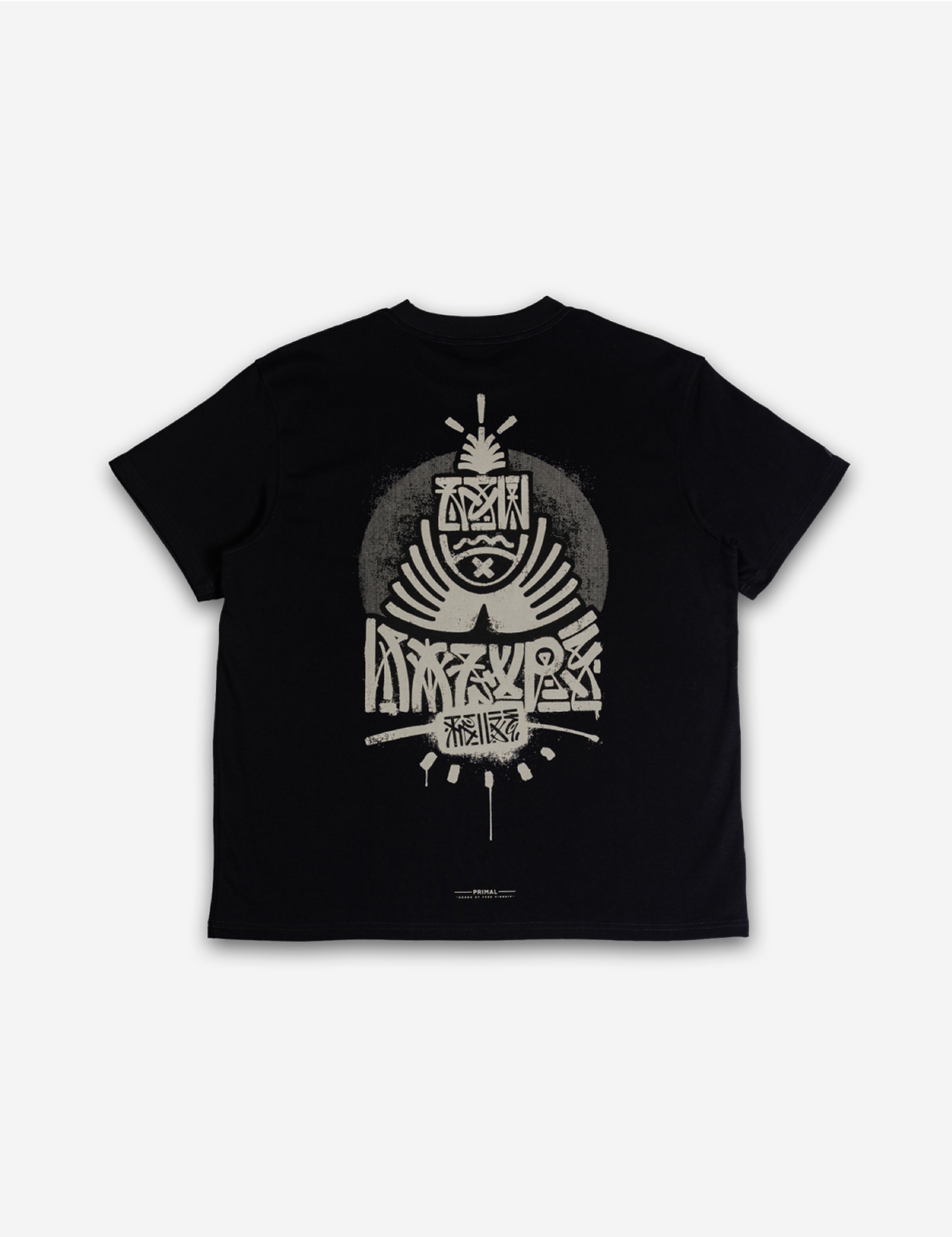 Camiseta de manga corta ligeramente oversize en color negro, fabricada con jersey de algodón pesado 100%, estampado en el frente y la espalda.