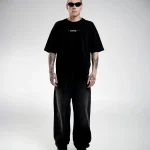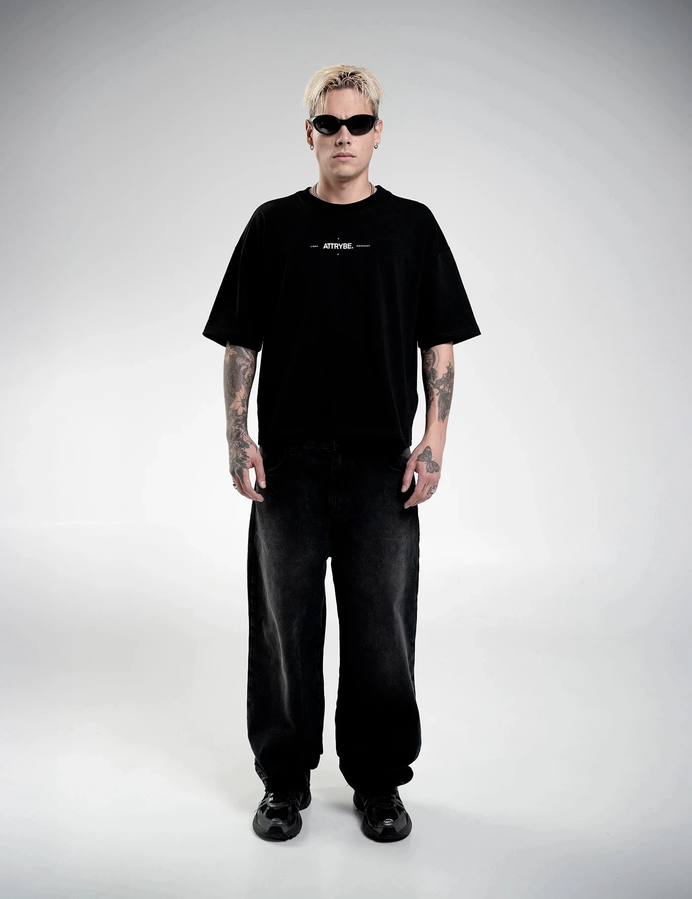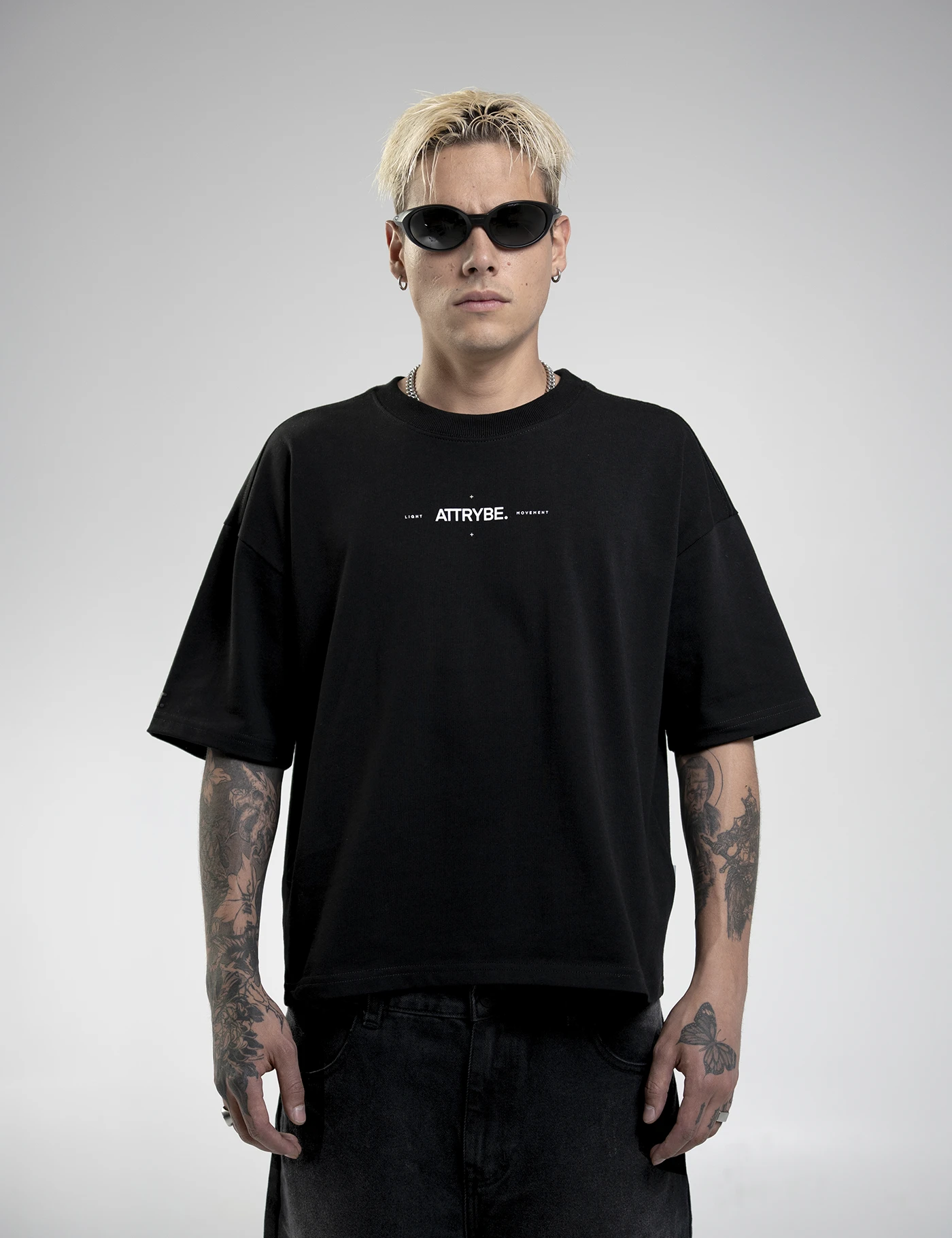 Camiseta manga corta, boxy fit en color negro. Fabricada en jersey de 100 % algodón pesado, estampada en el frente y en la espalda.