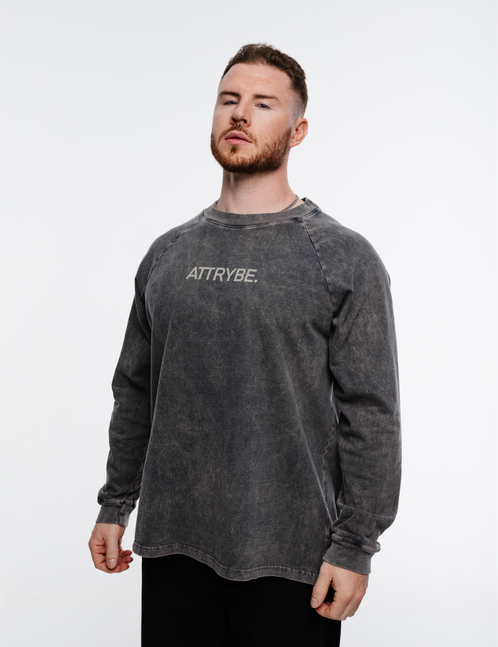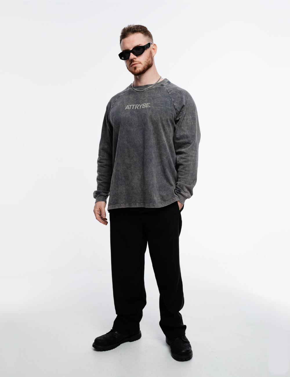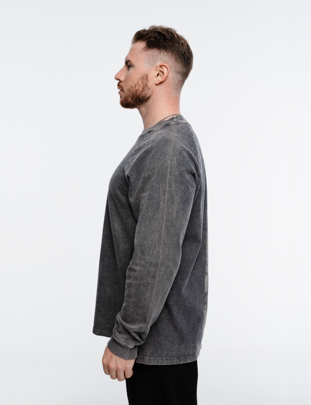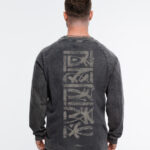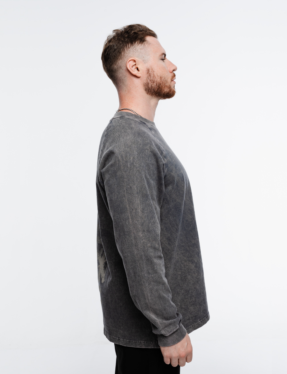 Camiseta manga larga de corte oversized con acabado de lavado ácido, confeccionada en jersey 100% algodón, con estampados en la parte frontal y posterior. El gráfico vertical «Primal» en la parte trasera está inspirado en el nombre de nuestra colección debut.