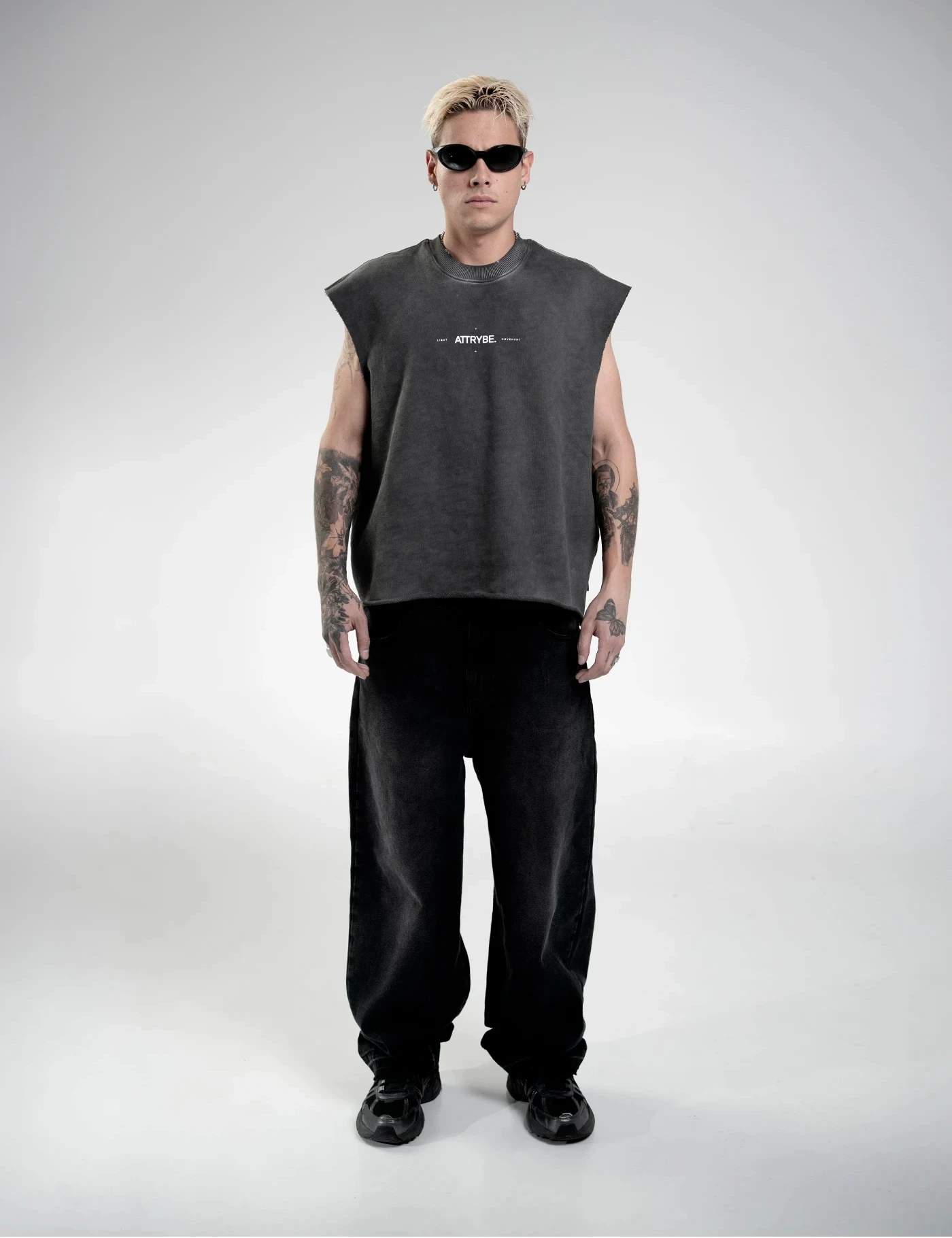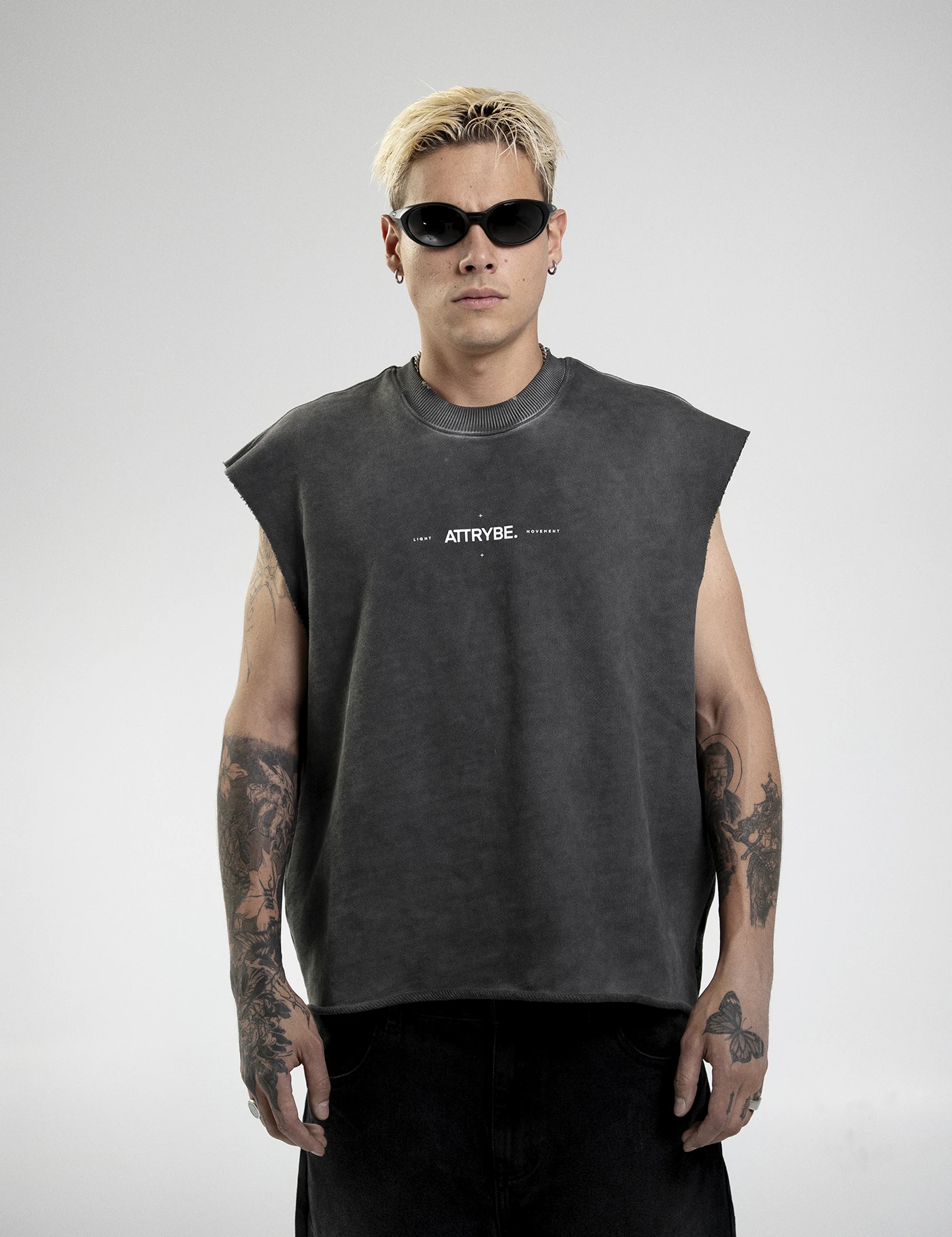 Camiseta sin mangas, boxy fit color gris con proceso de lavado. Fabricada en burda 100% algodón pesado, estampada en el frente y en la espalda.