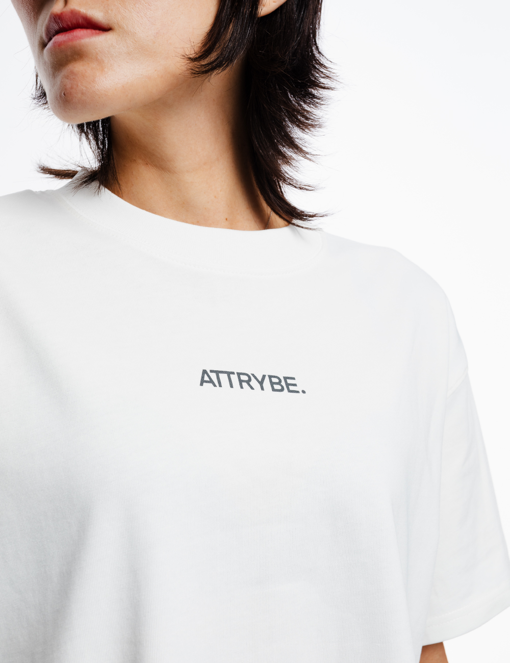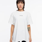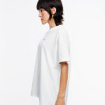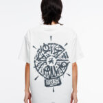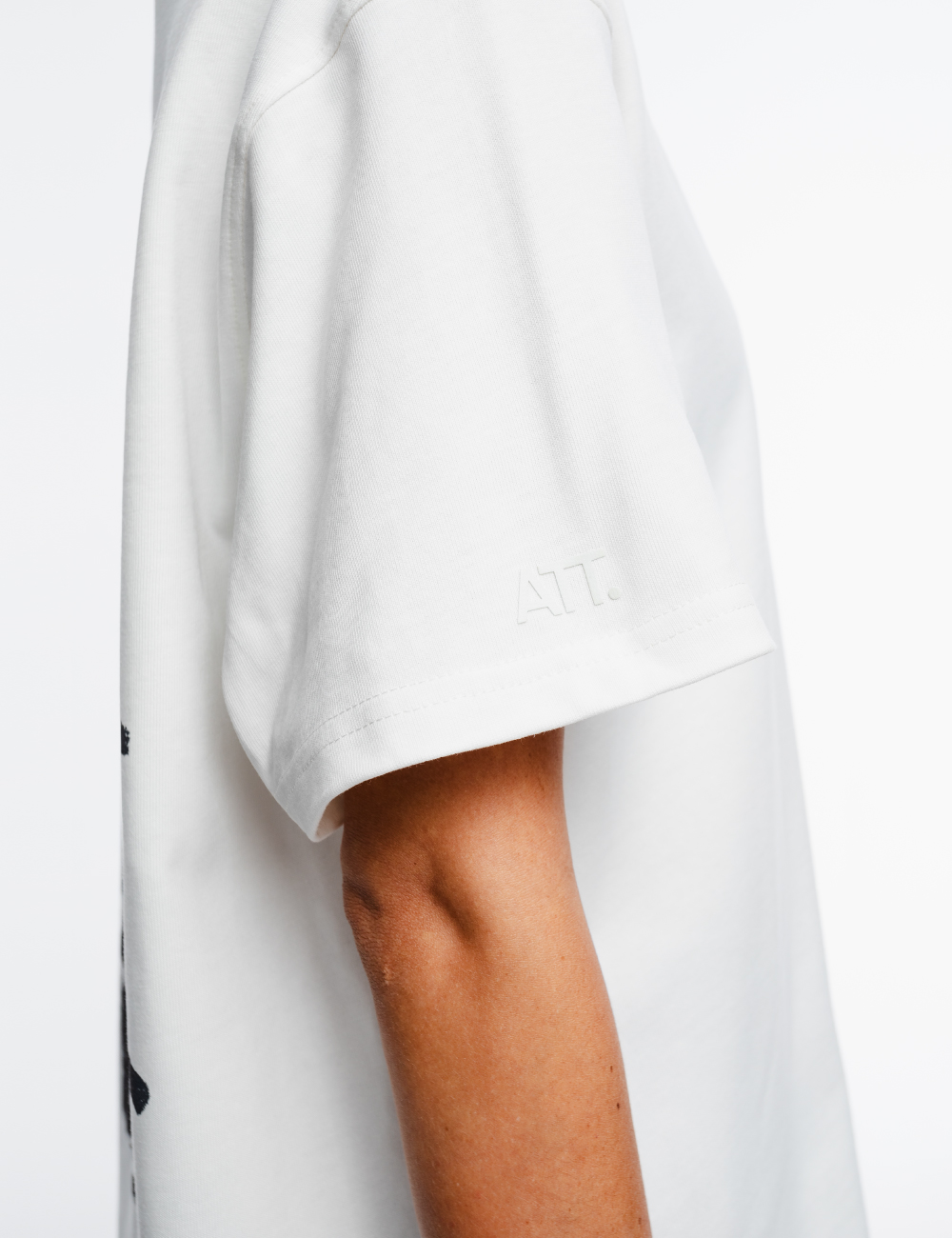 Camiseta de manga corta ligeramente oversize en color ivory, fabricada con jersey de algodón pesado 100%, estampado en el frente y la espalda.