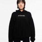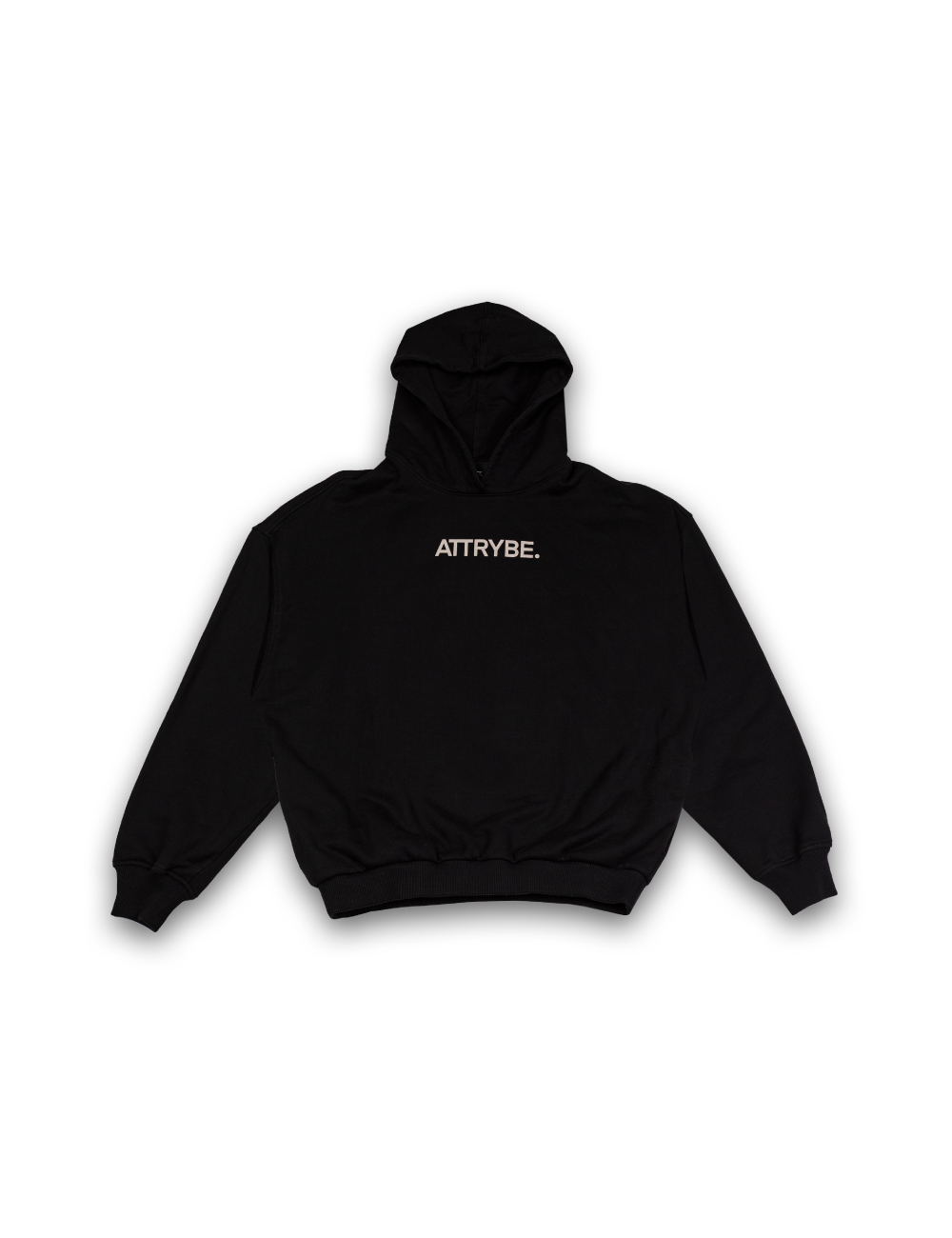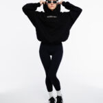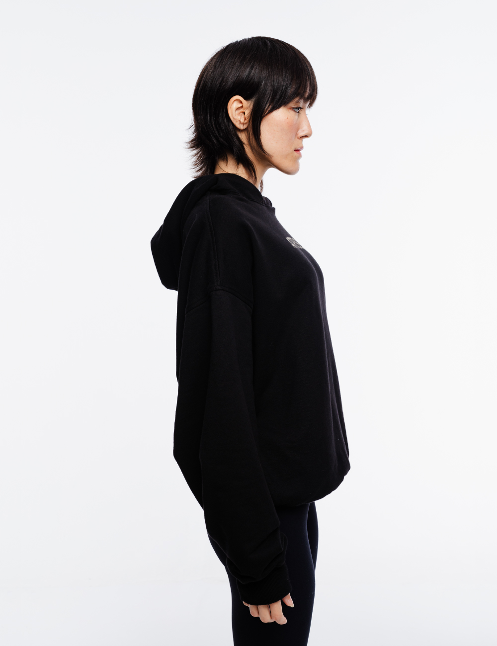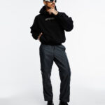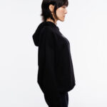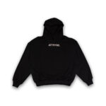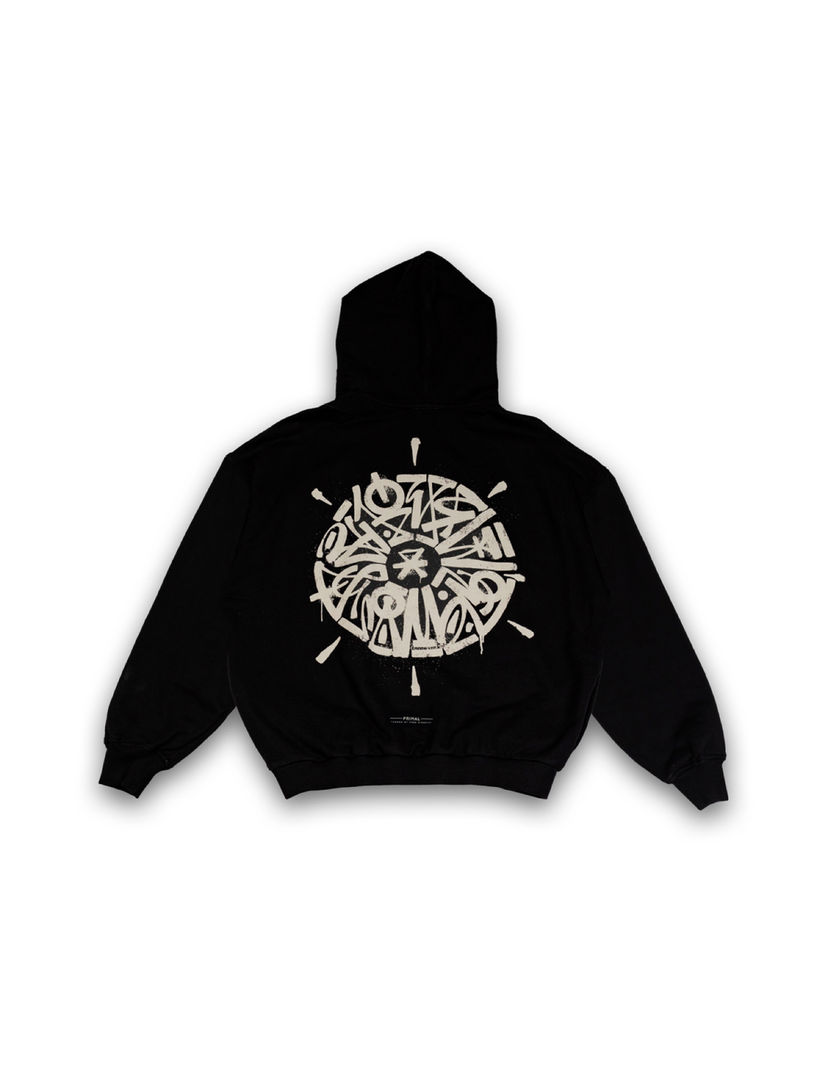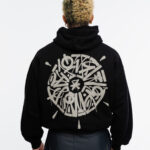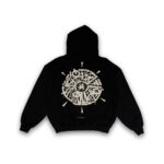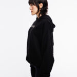 Hoodie de corte oversized en color negro, confeccionado en tela gruesa 100% algodón con estampados en la parte frontal y posterior.